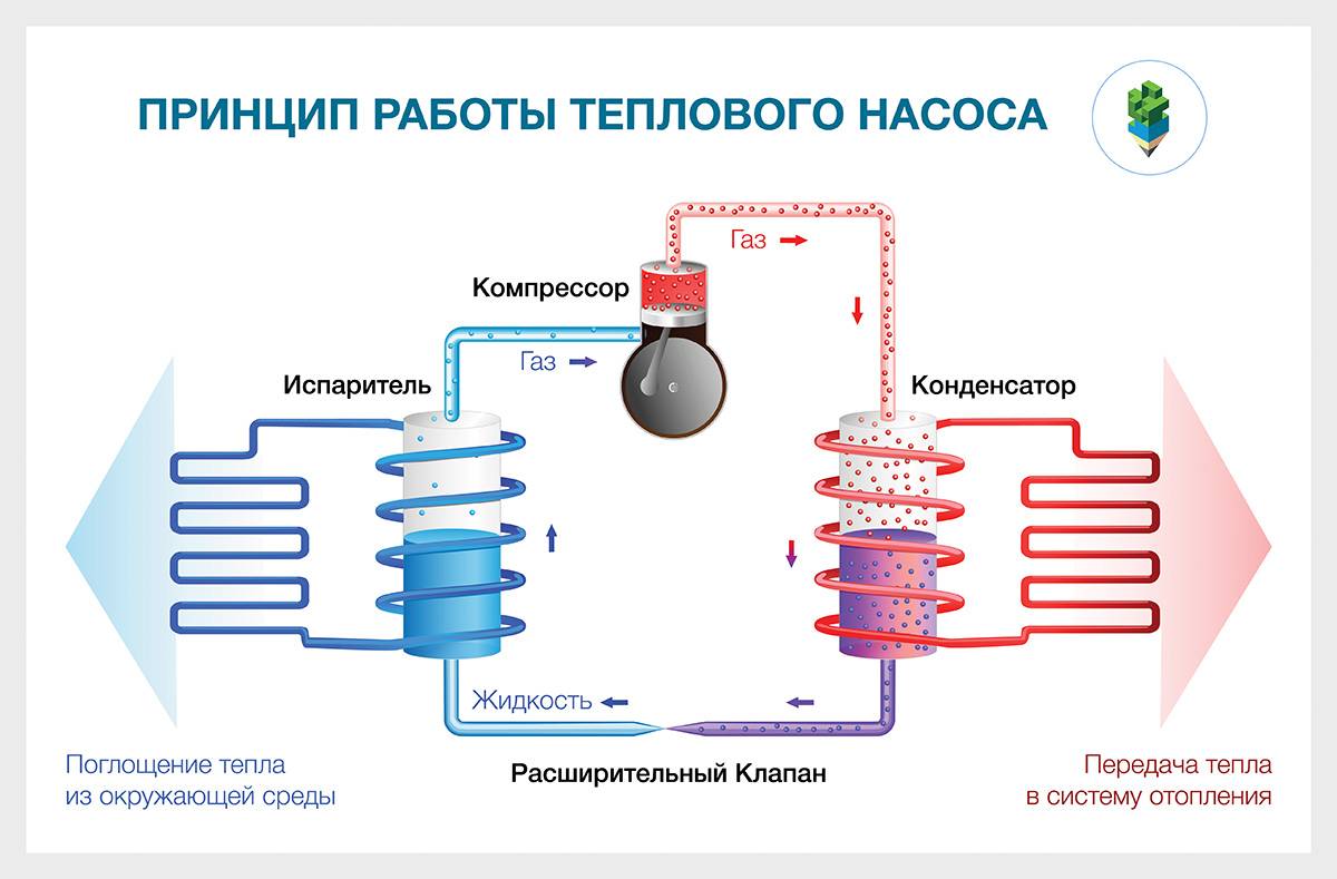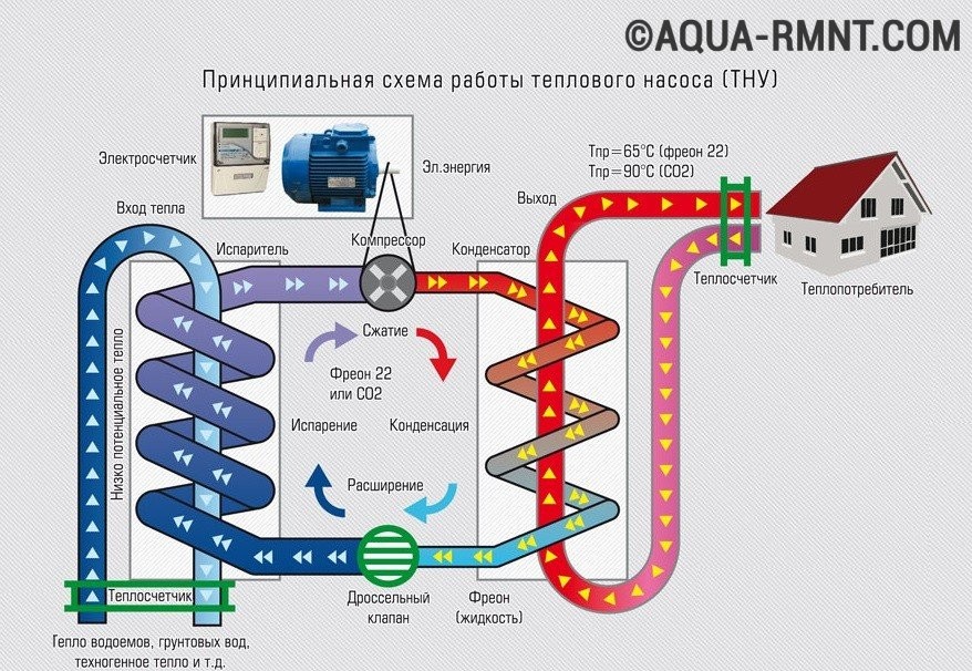 La composition de l'installation de chauffage comprend : évaporateur ; condensateur; une soupape de décharge qui abaisse la pression dans le système ; compresseur surpresseur. Chacun de ces nœuds est relié l'un à l'autre par un circuit fermé du pipeline, à l'intérieur duquel se trouve le réfrigérant. Le réfrigérant dans les premiers cycles est à l'état liquide, dans le suivant - à l'état gazeux. Cette substance a un point d'ébullition bas, par conséquent, avec l'option d'un équipement de type terre, elle est capable de se transformer en gaz, atteignant le niveau de température du sol. Ensuite, le gaz entre dans le compresseur, où il y a une forte compression, ce qui entraîne un échauffement rapide. Après que la vapeur chaude pénètre à l'intérieur de la pompe à chaleur, et est déjà utilisée directement ici pour le chauffage des locaux ou pour chauffer de l'eau. Le réfrigérant se refroidit ensuite, se condense et se reliquide. À travers le détendeur, la substance liquide s'écoule dans la partie souterraine pour répéter le cycle de chauffage.