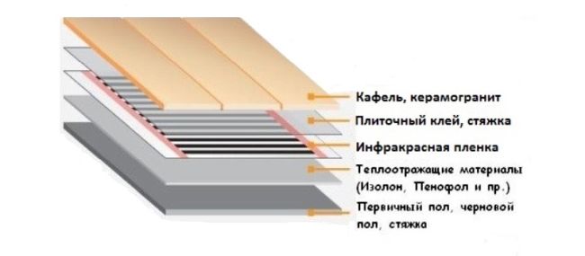 - Plancher avec chauffage infrarouge. C'est la nouvelle façon de se réchauffer.Pour l'installation d'un tel sol, la largeur de couverture requise est sélectionnée avec une puissance de 80 à 220 watts. Sous le film, un lavsan d'au moins 5 mm d'épaisseur est posé sur le sol et le film est déjà posé dessus, de sorte que le côté cuivre soit en bas.