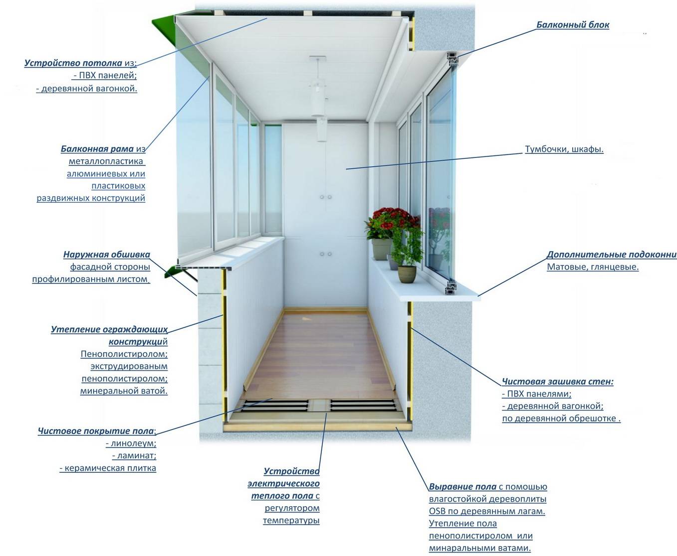 - Des radiateurs électriques, des éclairages, etc. peuvent être installés sur la loggia. Le câblage électrique est monté à l'intérieur dans des boîtes incombustibles.