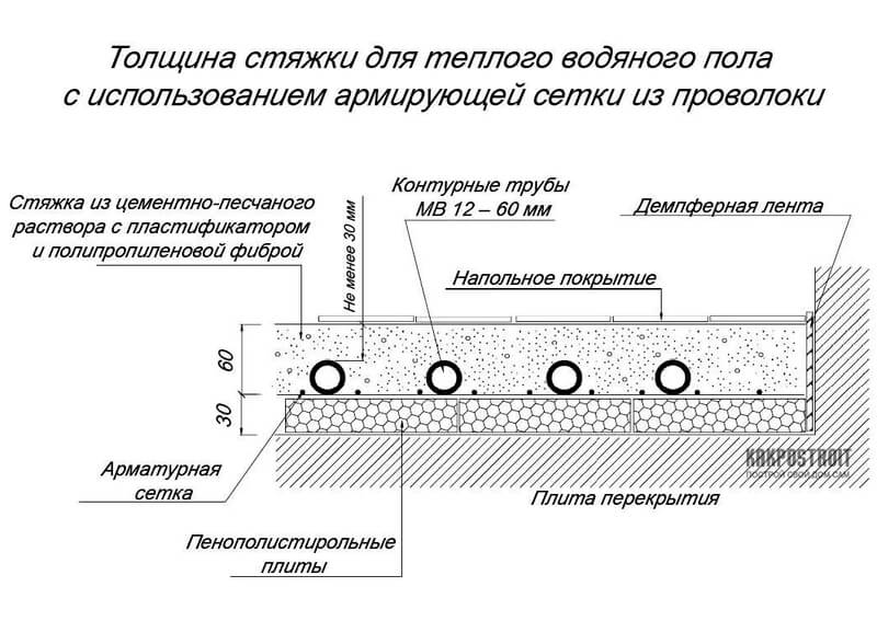 Premièrement : le poids important de la chape.Toutes les fondations et les plafonds des maisons ne sont pas capables de supporter la charge créée par un plancher chauffé à l'eau dans une chape en béton. Au-dessus de la surface des tuyaux, il doit y avoir une couche de béton d'au moins 3 cm.Si nous tenons compte du fait que le diamètre extérieur du tuyau est également d'environ 3 cm, l'épaisseur totale de la chape est de 6 cm.Le poids est plus qu'important. Et en plus il y a souvent un carreau sur une couche de colle. Eh bien, si la fondation est conçue avec une marge, elle résistera, et sinon, les problèmes commenceront. Si l'on soupçonne que le plafond ou la fondation ne résistera pas à la charge, il est préférable de fabriquer un système en bois ou en polystyrène.