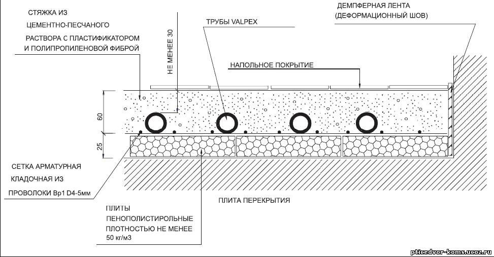 • pose de mélange de béton pour chape. La chape elle-même est installée à un niveau non inférieur à 3 et non supérieur à 15 cm au-dessus des tuyaux. En vente, il existe un mélange spécialisé prêt à l'emploi pour la chape;
