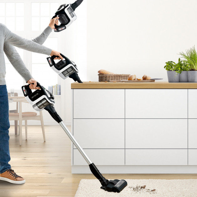 BBH 21621 (150W) : Appareil vertical 2 en 1 avec mini aspirateur détachable. La batterie tient une charge jusqu'à 32 minutes, accumule de l'énergie pendant 16 heures. Il est prévu de changer la puissance de la poignée (elle fonctionne en 2 modes), la poussière et les débris s'accumulent dans un conteneur cyclone (capacité - 0,3 litre). Une brosse plate est ajoutée à la buse traditionnelle pour sols et tapis. Il y a un indicateur de décharge de la batterie. Poids unitaire - 3 kg, niveau sonore - 51 dB.