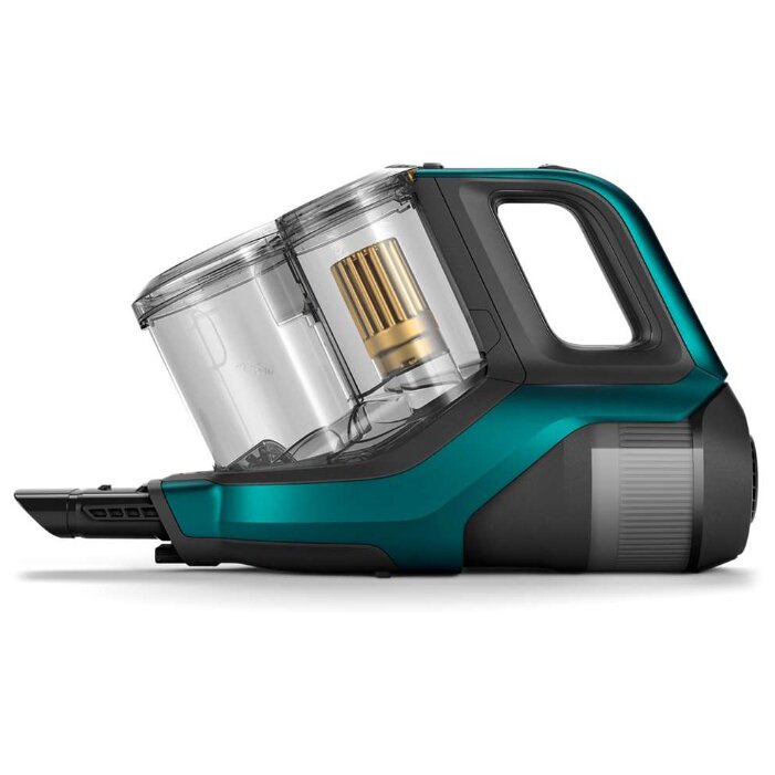 Aspirateur compact sans fil pour le nettoyage à sec, équipé d'un filtre cyclone. Capacité du bac à poussière 0,6 l. Grâce à la filtration en trois étapes, la poussière n'est pas rejetée dans la pièce, mais reste dans le réservoir. Le kit comprend une brosse électrique TriActive Turbo, un suceur plat et une brosse régulière.