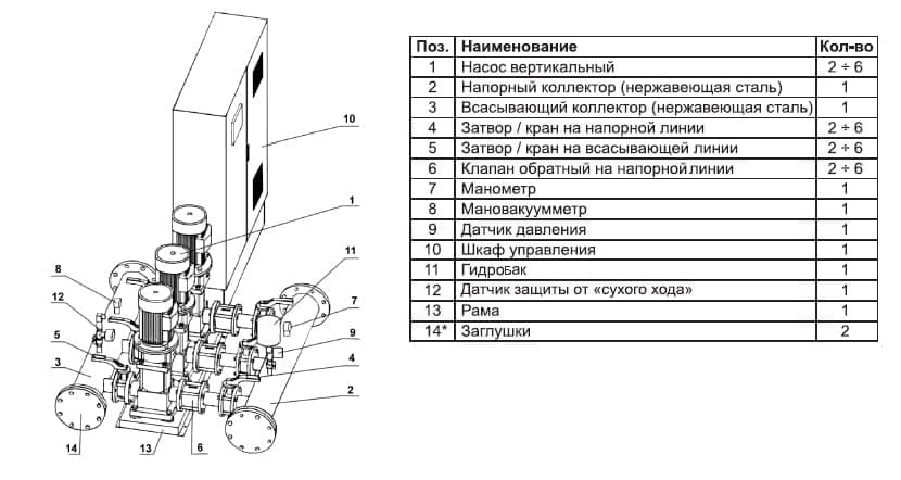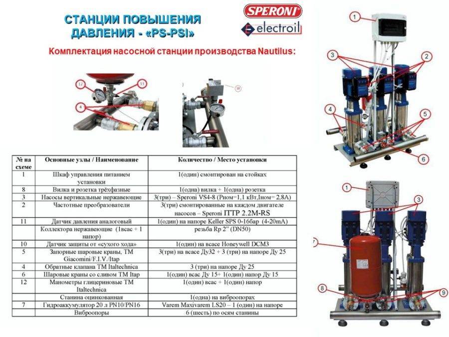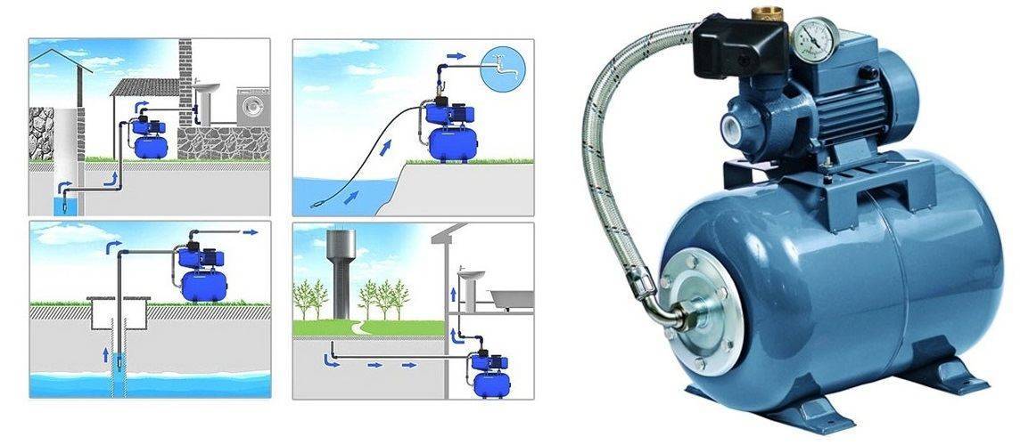 Le fonctionnement de la station de pompage est réalisé à l'aide d'une pompe, d'un accumulateur hydraulique et d'un système d'automatisation qui régule la pression. Lorsque l'unité est démarrée, l'eau commence à être pompée dans le réservoir sous pression (accumulateur hydraulique) et plus loin dans la canalisation.