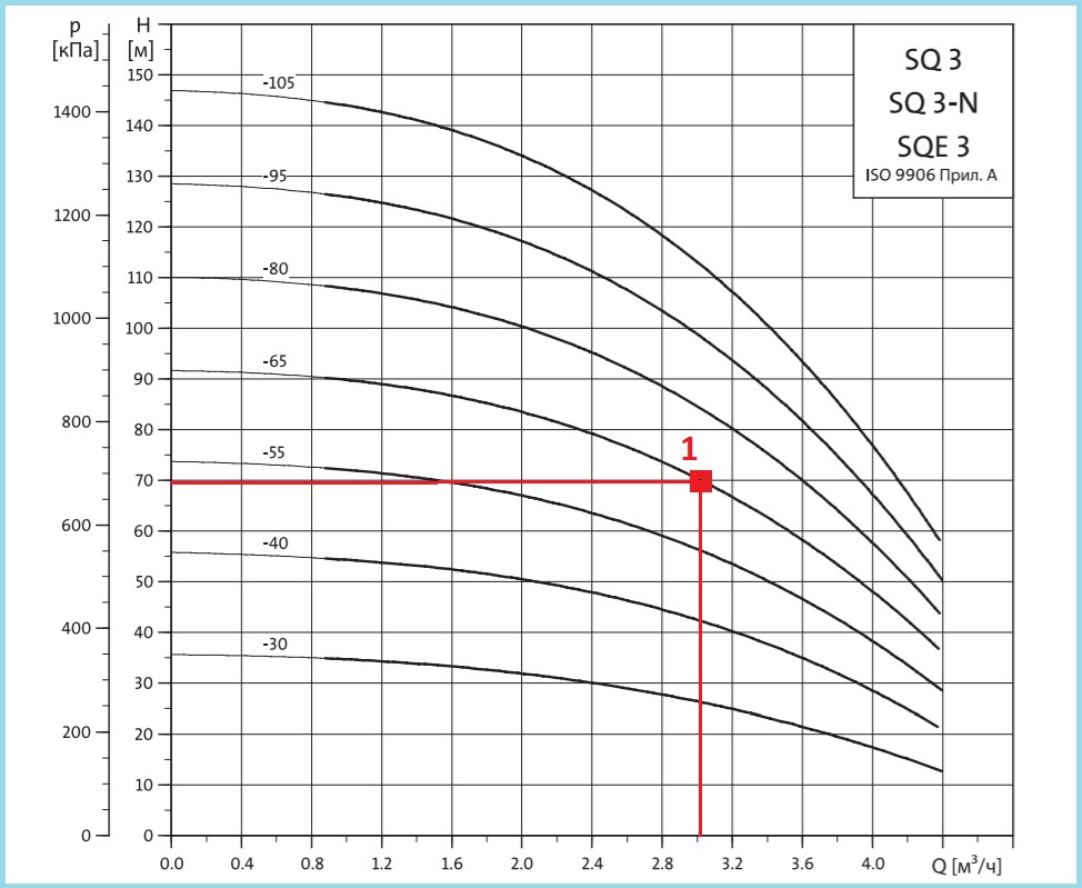 La puissance du moteur est de 1200 W, ce qui permet de pomper du liquide jusqu'à une hauteur de 140 mètres. L'appareil est installé dans des puits étroits d'un diamètre d'au moins 110 millimètres et est capable de fournir près de 42 litres d'eau par minute.