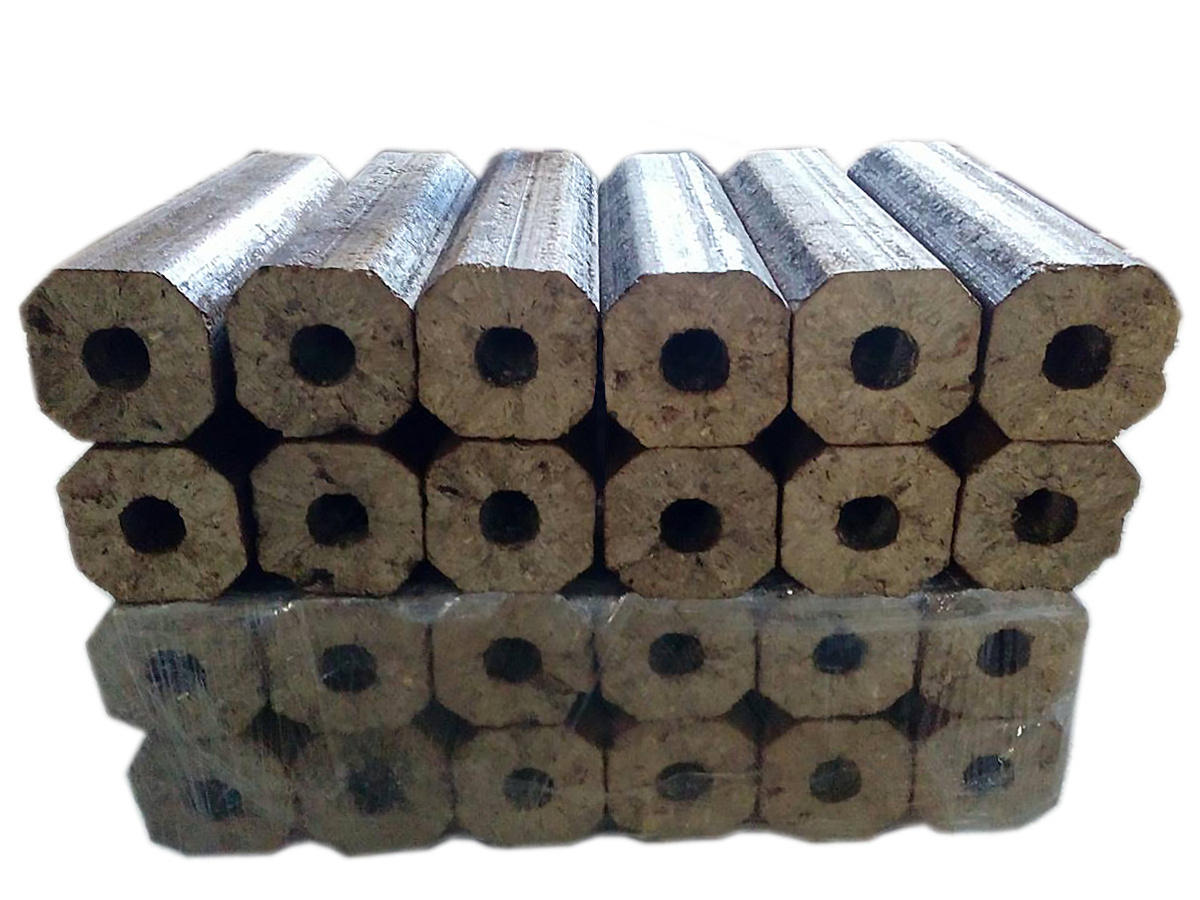 — carburant de densité maximale (1,08–1,40 g/cm³). Fabriqué sous forme de briquettes carrées/hexagonales. Pour assurer une circulation d'air efficace dans le four, les fabricants font un trou traversant dans chacune de ces "bûches".