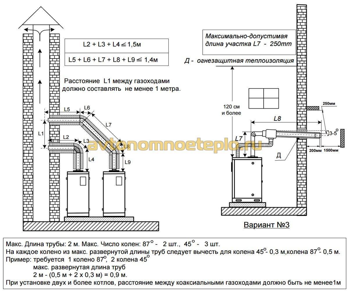 Dans les maisons existantes, la section de la cheminée doit correspondre aux performances des deux chaudières raccordées. De plus, les connexions doivent être à différents niveaux, et la distance entre eux n'est pas moindre 0,75 mètres. Soit, le raccordement peut se faire au même niveau, mais à partir de cet endroit et 0,75 m plus haut, il faut faire une coupe dans la cheminée en assurant la bonne section (ce qui est rare en pratique).