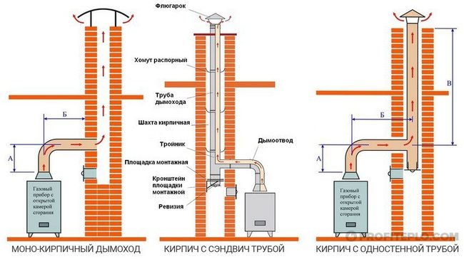 Pas plus de 2 chaudières (appareils de chauffage, poêles ...) peuvent être raccordées à une cheminée, mais uniquement dans les maisons existantes. Dans d'autres, chaque chaudière à gaz doit être équipée de sa propre cheminée.