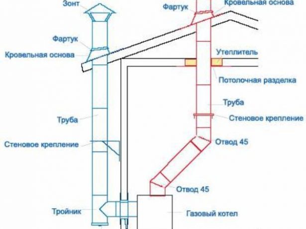 Les cheminées d'une chaudière à gaz sont installées dans le sens de la structure de bas en haut, c'est-à-dire des objets chauffants de la pièce vers la cheminée. Avec cette installation, le tube intérieur est mis sur le précédent et le tube extérieur est inséré sur le précédent.