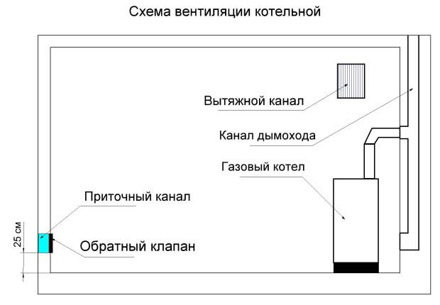 Les communications de ventilation sont montées dans le mur opposé à la chaudière. Un treillis et un registre doivent être installés dans le tuyau de ventilation. Dans les chaufferies situées dans une pièce séparée, vous devrez réaliser un conduit de ventilation dans la porte avec une grille à persiennes.