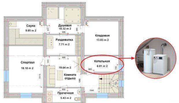 Une chaufferie dans une maison particulière peut être aménagée au sous-sol, dans les combles (déconseillé) ou simplement dans une pièce spécialement aménagée pour ces tâches.