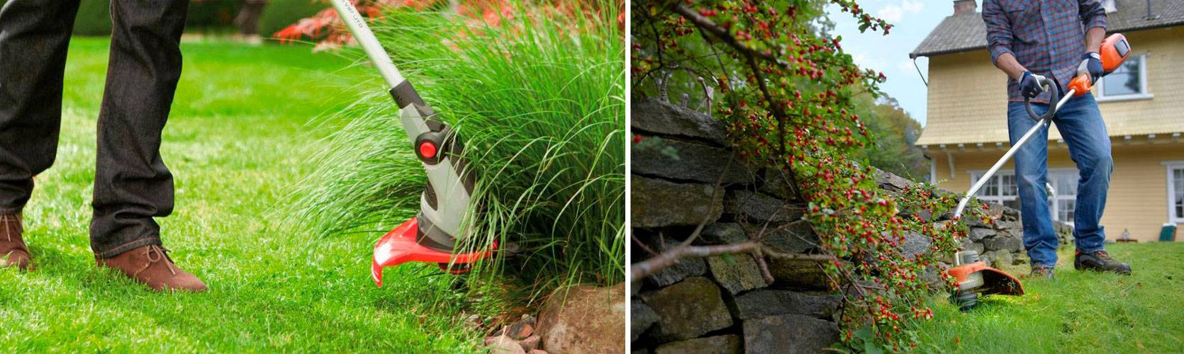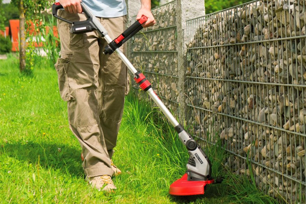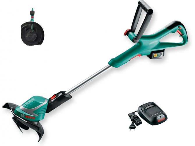 Tondeuse sans fil de haute qualité d'Allemagne. Considéré comme l'un des meilleurs de sa catégorie. Vous pouvez y mettre à la fois une ligne de pêche et des couteaux. Poids - 2,3 kg. Diffère dans des indicateurs extrêmement bas de vibration et de bruit. Idéalement attaché et ne surcharge pas le propriétaire. La batterie dure 20 minutes, recharge complète - 3,5 heures.