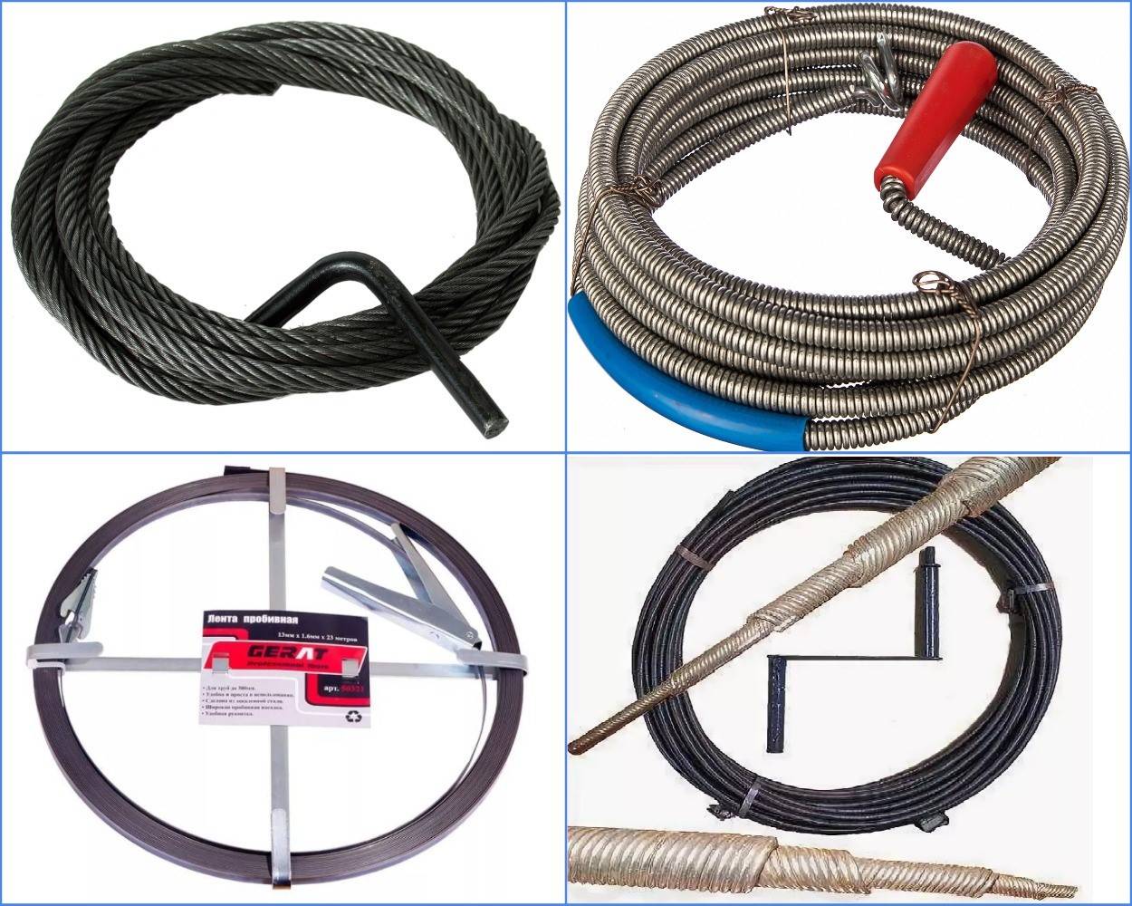 Le fil de corde est l'option la plus couramment utilisée pour nettoyer les égouts dans une maison.C'est une corde étroitement torsadée avec des bords sertis, en acier galvanisé. La longueur de la corde varie de 2,5 à 5 m et le diamètre de la section est généralement de 6 mm. En raison de la flexibilité et de l'élasticité du produit, un tel dispositif surmonte facilement les virages et les raccordements du système d'égout, éliminant avec succès le blocage qui en résulte.
