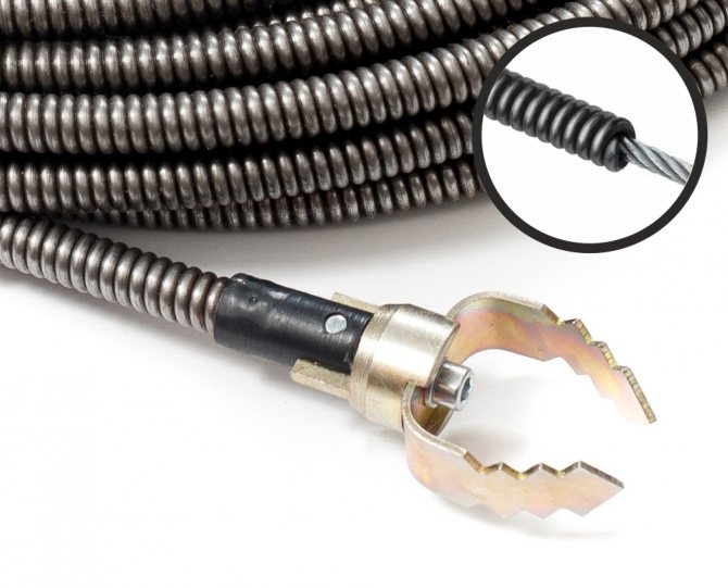 - Produits de nettoyage souples. Ce câble professionnel est plus efficace et plus facile à utiliser que les produits de type câble. Ce dispositif de nettoyage des canalisations se présente sous la forme d'une spirale métallique étroitement enroulée autour d'une âme en acier. Le câble flexible professionnel est complété par la poignée pratique pour sa rotation. Le diamètre de l'appareil peut atteindre 2,8 cm et sa longueur atteint parfois 60 m.