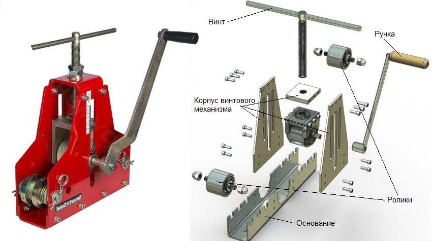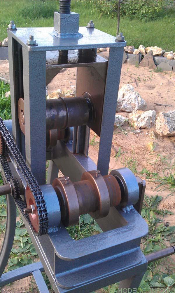 Pas moins populaire dans la fabrication le bricolage est un diagramme de cintreuse de tuyaux avec cadre de pause. Structurellement, il diffère en ce que tous les rouleaux qu'il contient sont fixes, c'est-à-dire qu'ils ne font que tourner, mais se déplacent de haut en bas.