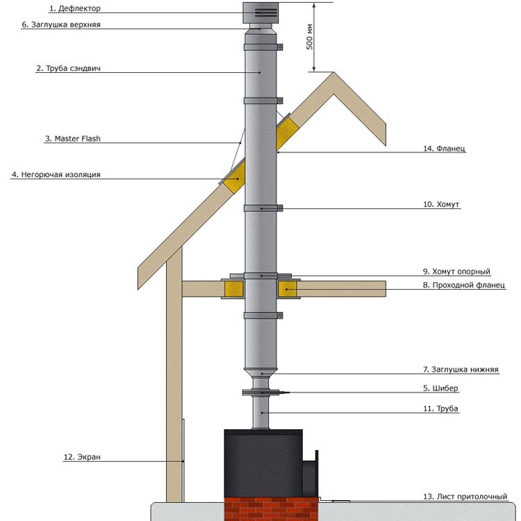 L'installation de tuyaux qui évacuent les produits de combustion s'effectue généralement à travers le plafond et les pentes du toit de la maison. Et ces conceptions de bâtiments de campagne privés sont dans la plupart des cas assemblées à partir de bois et de planches. Afin d'assurer la sécurité incendie, lors de la pose de cheminées à travers des planchers et des pentes en bois, des cartouches spéciales à isolation thermique sont utilisées.