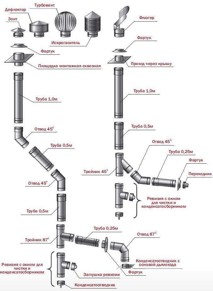 Les cheminées en fer et en céramique sont montées à l'aide de tés et de coins conventionnels. Lors de l'installation du tuyau de sortie, ses pièces sont assemblées comme un concepteur à l'aide d'un scellant. Mais en plus des coins et des tés, divers éléments supplémentaires spéciaux peuvent être utilisés lors de l'installation de cheminées.