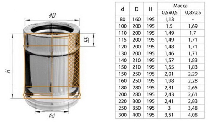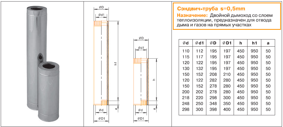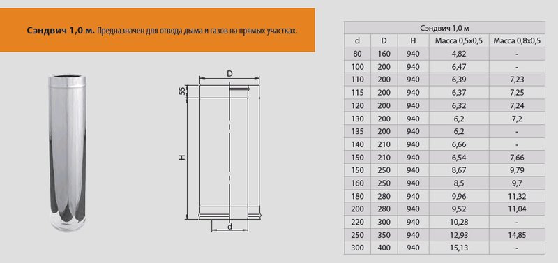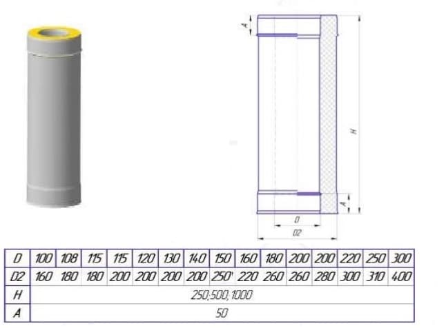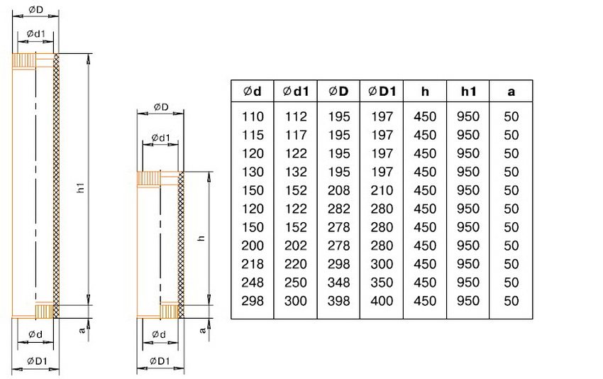 Une attention particulière doit être portée à la taille des tuyaux sandwich pour la cheminée. Il doit être choisi en fonction de la puissance de l'équipement de chauffage. La taille classique de la section transversale des tubes est de 120 mm
