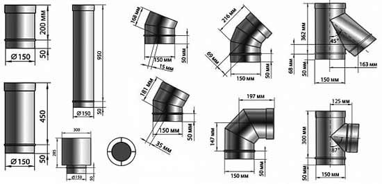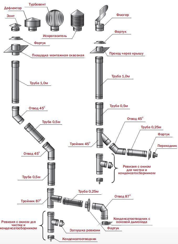 Le dispositif du tuyau, en tant que tel, n'a pas vraiment d'importance. Le nombre de coudes, de virages et d'autres obstacles sur le chemin des gaz de combustion ne fait qu'aggraver le tirage, vous devez donc essayer de rendre le tuyau aussi droit que possible.