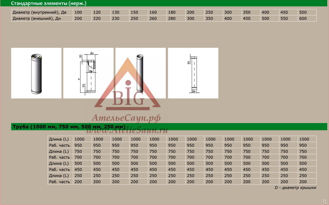 La taille de section classique des tubes est de 120 mm. La puissance optimale dans ce cas est jusqu'à 3,5 kW. Si un équipement de four plus puissant est utilisé, le diamètre du tuyau doit être augmenté. Le diamètre des cheminées sandwich pour chaudières ou fours d'une puissance de 5 kW est de 180 mm, 7 kW est de 220 mm.