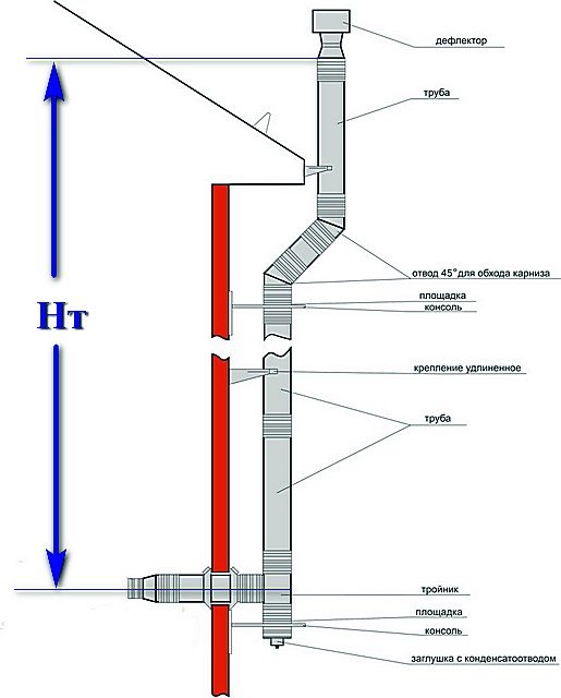 Cependant, les principales qualités de tirage sont déterminées par la hauteur du tuyau, qui est mesurée de la sortie de la chaudière à la tête du tuyau. La tête du tuyau s'appelle l'extrémité du tuyau, qui est cachée sous un parapluie. Soit dit en passant, l'existence d'un parapluie est obligatoire, c'est une protection destinée avant tout à la chaudière elle-même.L'humidité pénétrant dans la chambre de combustion peut endommager tous les équipements de la chaudière.