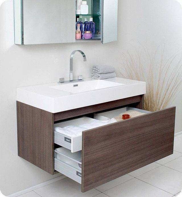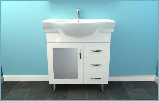 La taille du meuble de la salle de bain est choisie en fonction de la hauteur du lavabo et est limitée par son rebord inférieur. Si vous achetez un ensemble de meubles (meuble + lavabo suspendu), procédez à partir des normes générales de plomberie.