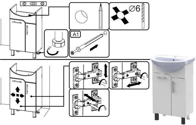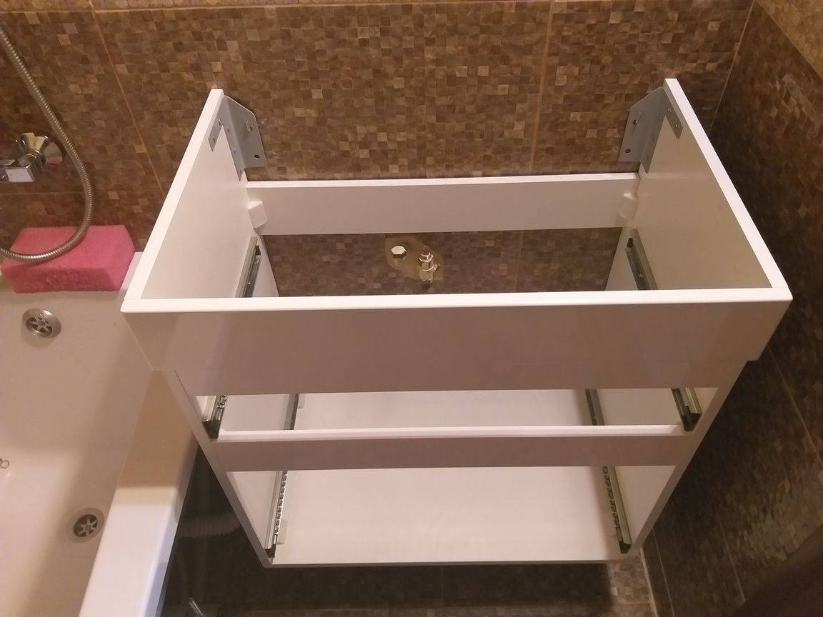 Si vous avez acheté le meuble non assemblé, vous devrez d'abord l'assembler avec un tournevis. Les instructions ci-jointes vous y aideront. assemblage de meubles. Au cours de cette procédure, assurez-vous que chaque pièce est fermement connectée à l'autre.Car après avoir installé l'évier dessus, il ne sera plus possible de serrer plus fort les vis.