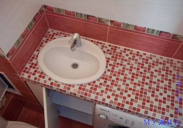 Un évier suspendu avec une armoire finie avec des carreaux, qui recouvre les murs de la salle de bain, semble intéressant. Un piquant charmant est ajouté par une petite mosaïque et une brique spéciale conçue pour le revêtement. Il est plus que rentable d'utiliser de la pierre artificielle - dans ce cas, aucune finition supplémentaire n'est nécessaire. En règle générale, les plans de travail d'un faux évier sont en pierre acrylique et en agglomérés, et les panneaux de particules ou MDF servent de base.