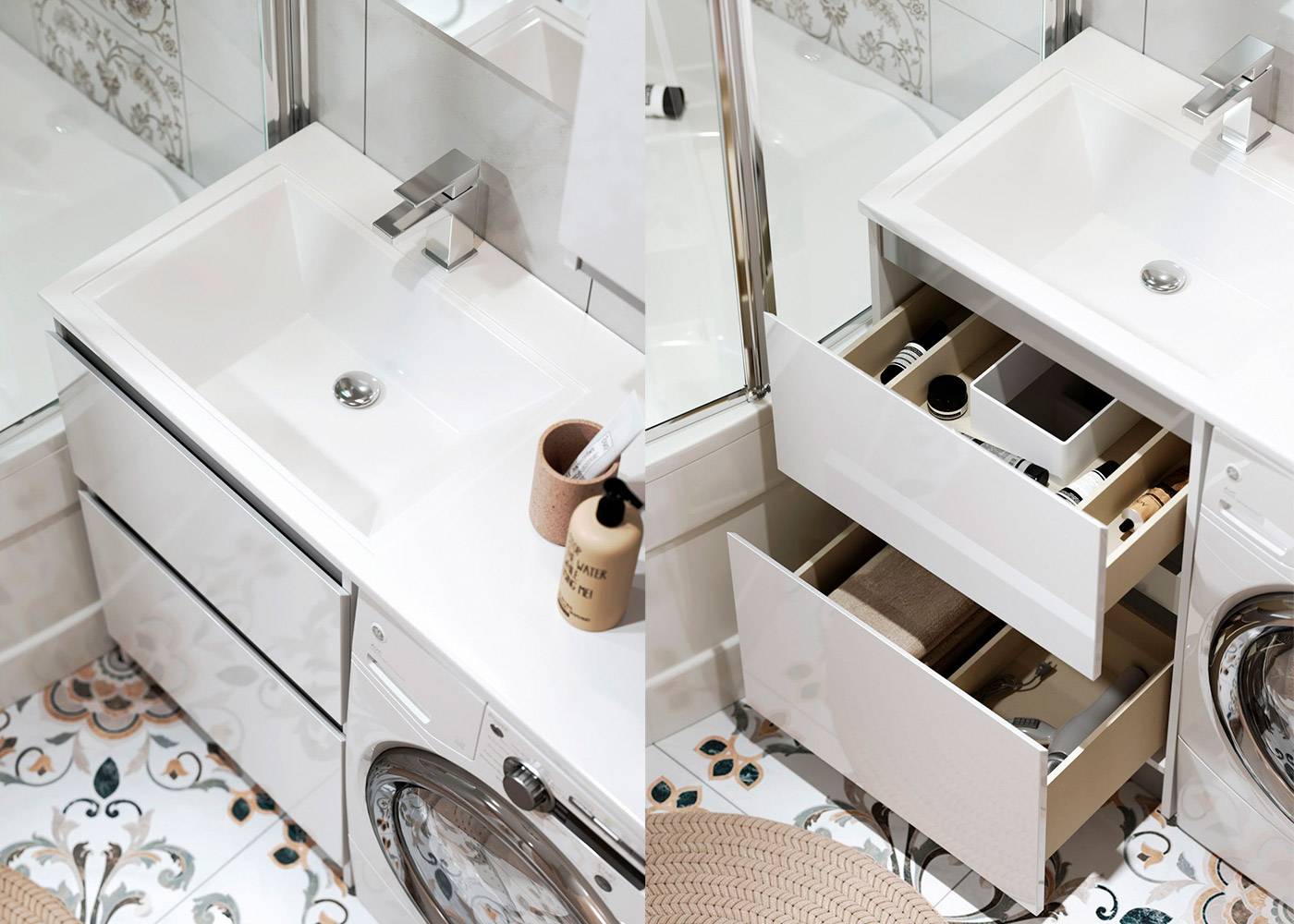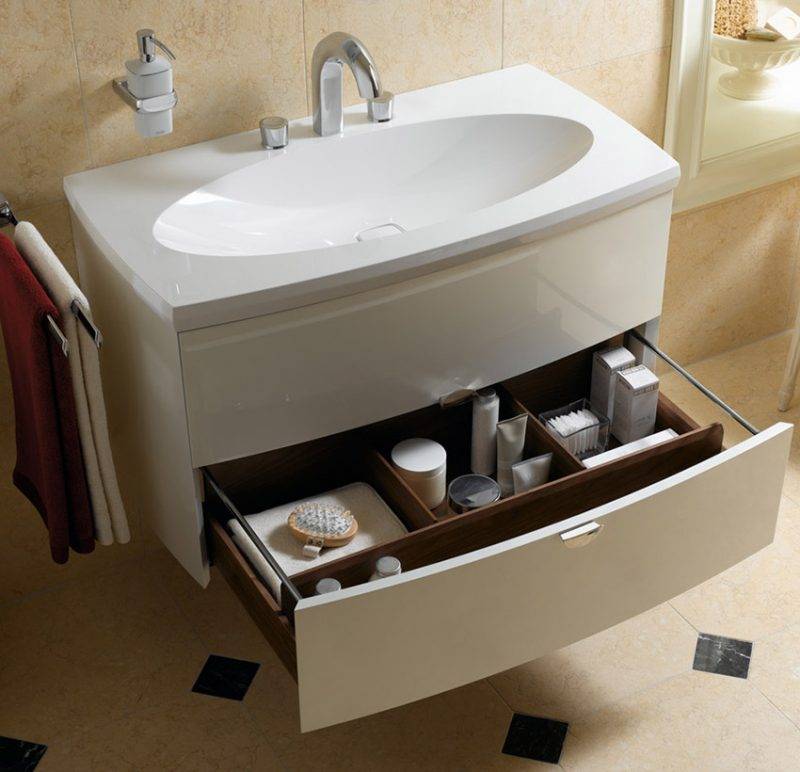 Les conceptions compactes avec un nombre minimum de tiroirs sont idéales pour les petites salles de bains. Le poids de ces articles est relativement faible, ce qui réduit considérablement la charge sur les murs. De tels modèles conviennent à tous les locaux, tout en économisant de l'espace libre.