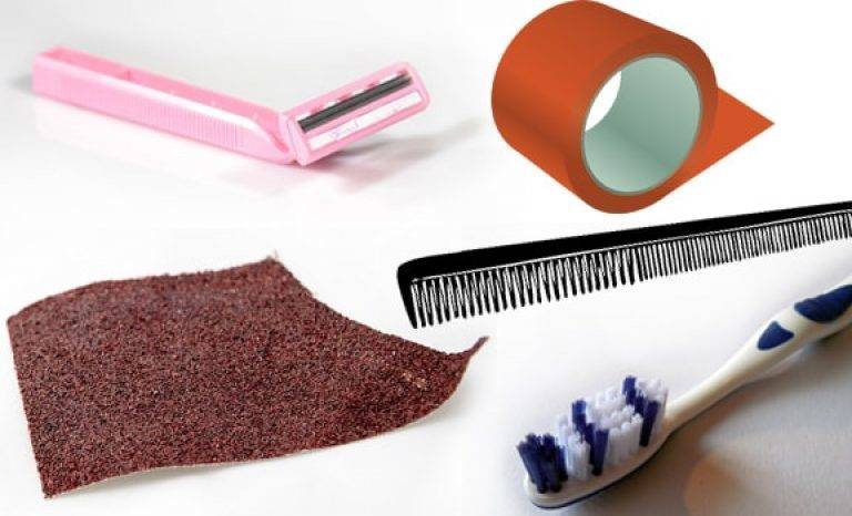 Le produit en laine est peigné dans le sens des fibres. Les plombs se coincent entre les dents et se détachent. Cette méthode express convient lorsqu'il n'y a pas d'autres moyens à portée de main. Les petites pastilles sont ensuite retirées avec du ruban adhésif ou du ruban adhésif.