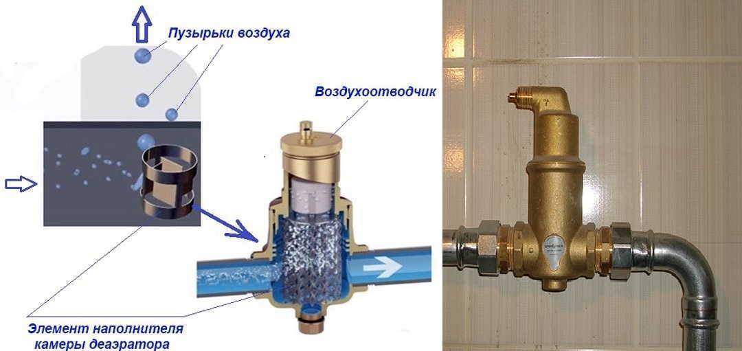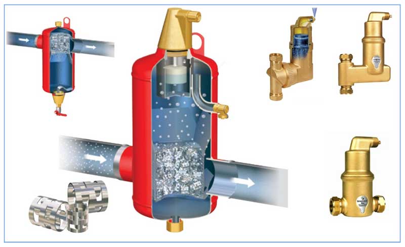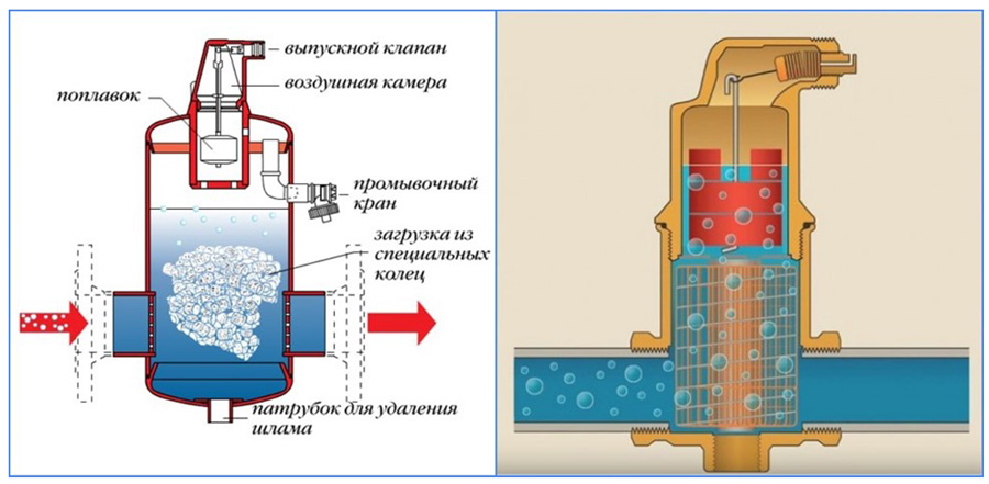 • Il existe sur le marché des analogues d'évents - séparateurs de microbulles, ils sont montés en série dans la canalisation sur deux tuyaux d'entrée correspondant au diamètre des tuyaux. Lorsque le liquide passe à travers le tube du corps avec un treillis de cuivre soudé, un flux d'eau vortex se crée, ce qui ralentit l'air dissous - cela contribue à la montée des plus petites bulles d'air, qui sont purgées à travers la soupape de purge d'air automatique du chambre.