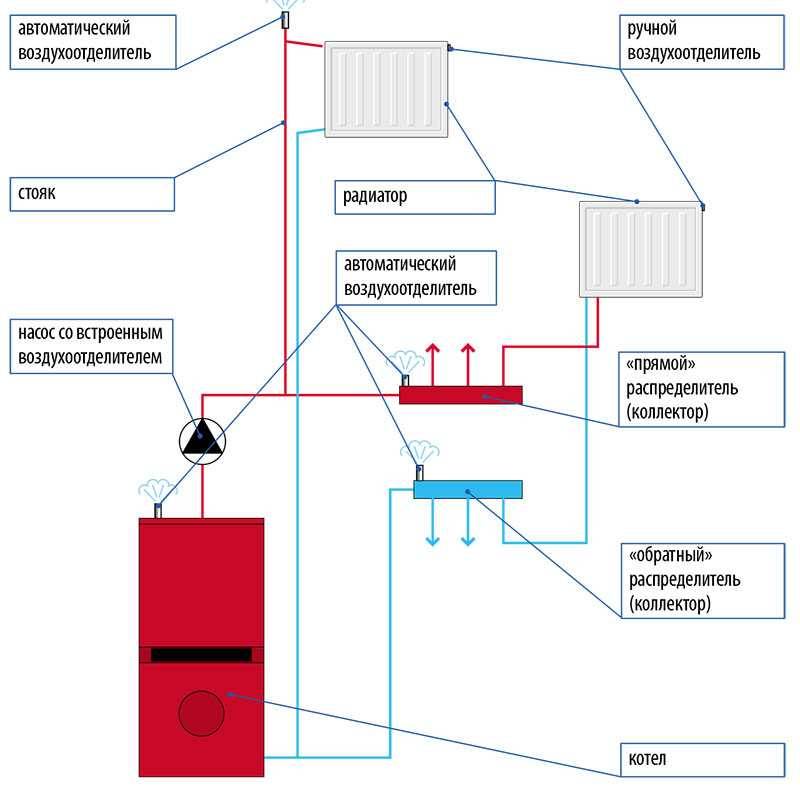 De manière optimale, si les radiateurs le long du circuit sont situés sur la colonne montante d'alimentation, alors en installer un deuxième avec un évent sur la ligne de retour résoudra le problème : il n'y aura pas d'air. Lorsque les radiateurs sont répartis sur deux colonnes montantes, il n'y a aucune garantie d'un résultat à 100 %.