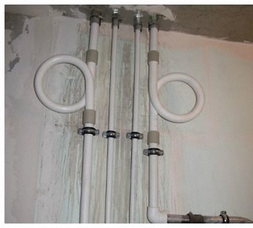 Le plus souvent, des sections de compensation en forme de boucle sont utilisées - des tours d'anneau avec une fixation mobile sur le mur. La boucle obtenue à la suite d'une telle installation se contracte et se dilate lorsque le liquide de refroidissement est chauffé / refroidi, sans affecter la position et la géométrie de la canalisation dans d'autres sections.