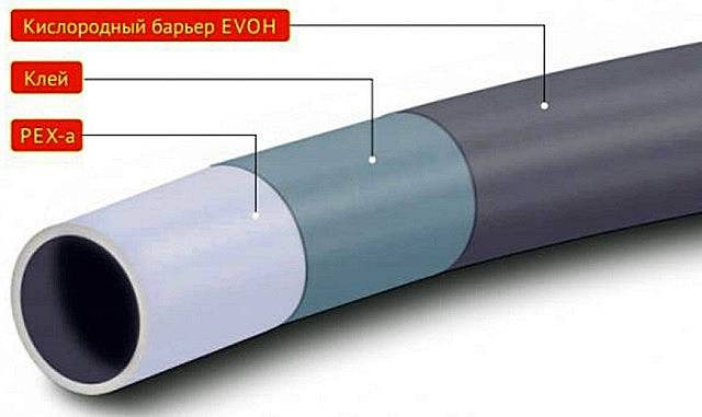 Nous examinerons séparément les produits en polyéthylène réticulé renforcé d'éthylène-alcool vinylique, car il est préférable de poser ces tuyaux de chauffage dans le sol. Ils sont labellisés PEX/Evon/PEX. Cette méthode de renforcement vous permet de faire d'une pierre deux coups. Premièrement, il réduit la dilatation linéaire du matériau à 0,021 mm/m, et deuxièmement, il crée une couche protectrice qui réduit la perméabilité à l'air des parois du tuyau. Ce chiffre est de 900 mg par 1 m 2 par jour.