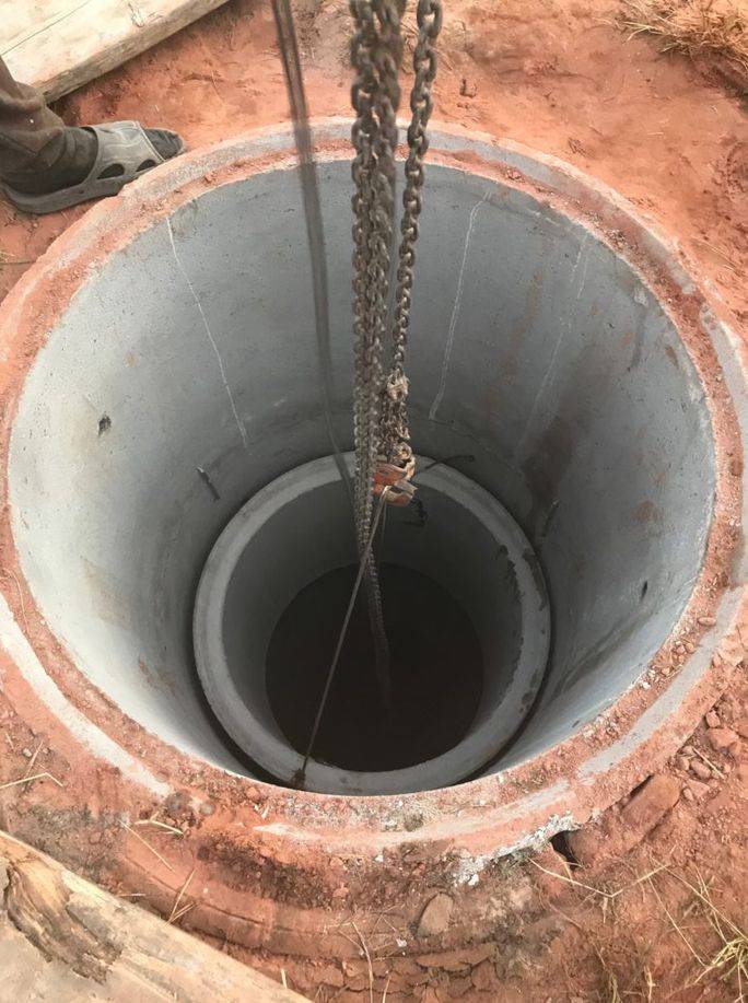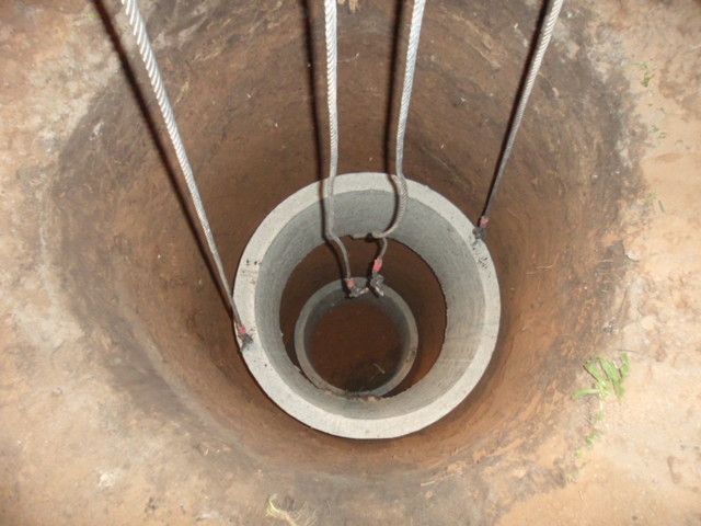 La première étape consiste à creuser un trou dans l'aquifère, son diamètre doit être de 15 cm, le diamètre des anneaux en béton armé.