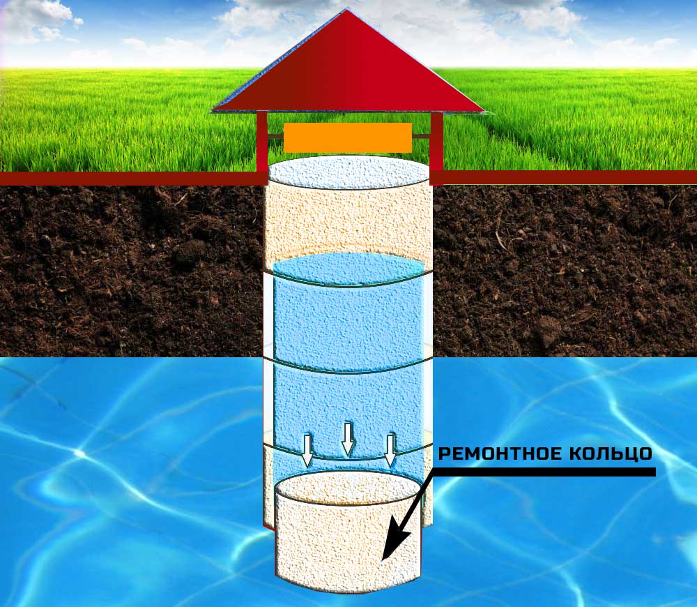 Pose de bagues de réparation | La méthode la plus populaire consiste à rendre la structure d'admission plus profonde. Ici, le sol est retiré du fond du puits, puis des anneaux de béton sont abaissés, ayant un diamètre inférieur à celui des anneaux utilisés pour construire la mine elle-même. |