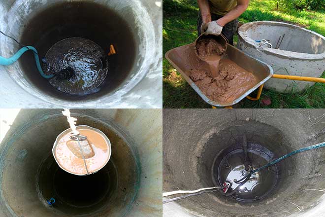 Encore une fois, nous examinons les parois du puits. S'ils sont très sales, nous les nettoyons. Nous grattons la mousse et les dépôts des murs des anneaux en béton. Si, à la suite de l'inspection, des fissures et des éclats sont révélés, nous réparons les parois du puits et les joints entre les anneaux.