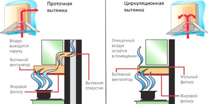 Il existe deux types de hottes : à flux direct et à recirculation ; Le premier type d'équipement dispose d'un filtre à graisse métallique qui élimine les dépôts de graisse de l'air et les empêche de "s'asseoir" sur les composants internes des équipements complexes. Ces modèles n'ont pas de filtre à charbon, car le reste de l'air est évacué de la pièce grâce à un tuyau spécial - une sortie d'air. Pour assurer une bonne circulation de l'air dans la cuisine avec la hotte à flux direct allumée, ouvrez légèrement la fenêtre ou la fenêtre afin que l'air frais pénètre dans la pièce et améliore encore le fonctionnement de la hotte.