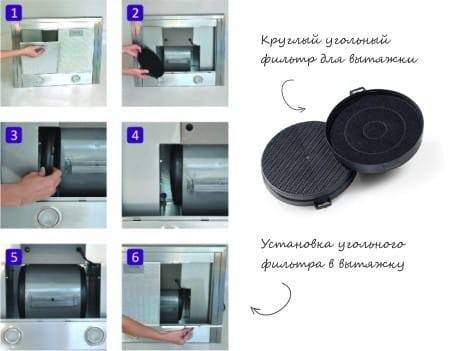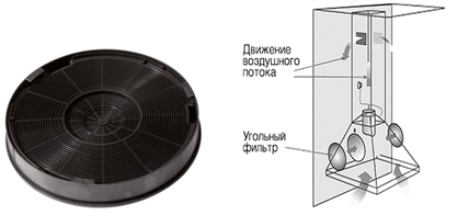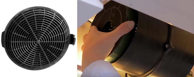 Le filtre à charbon universel dans la hotte de cuisine réduit le travail de l'équipement : l'air est aspiré un peu moins bien que dans le modèle traditionnel, cependant, une hotte correctement installée peut parfaitement fonctionner dans la cuisine si la zone de cuisson n'est pas trop grande. Un filtre à charbon typique ressemble à une base en plastique (ronde ou rectangulaire) avec un trou pour le charbon actif. Le remplacement du filtre est nécessaire régulièrement : pendant environ 3 à 6 mois, le filtre usagé doit être retiré et un nouveau mis en place afin que la hotte ne perde pas sa fonctionnalité.
