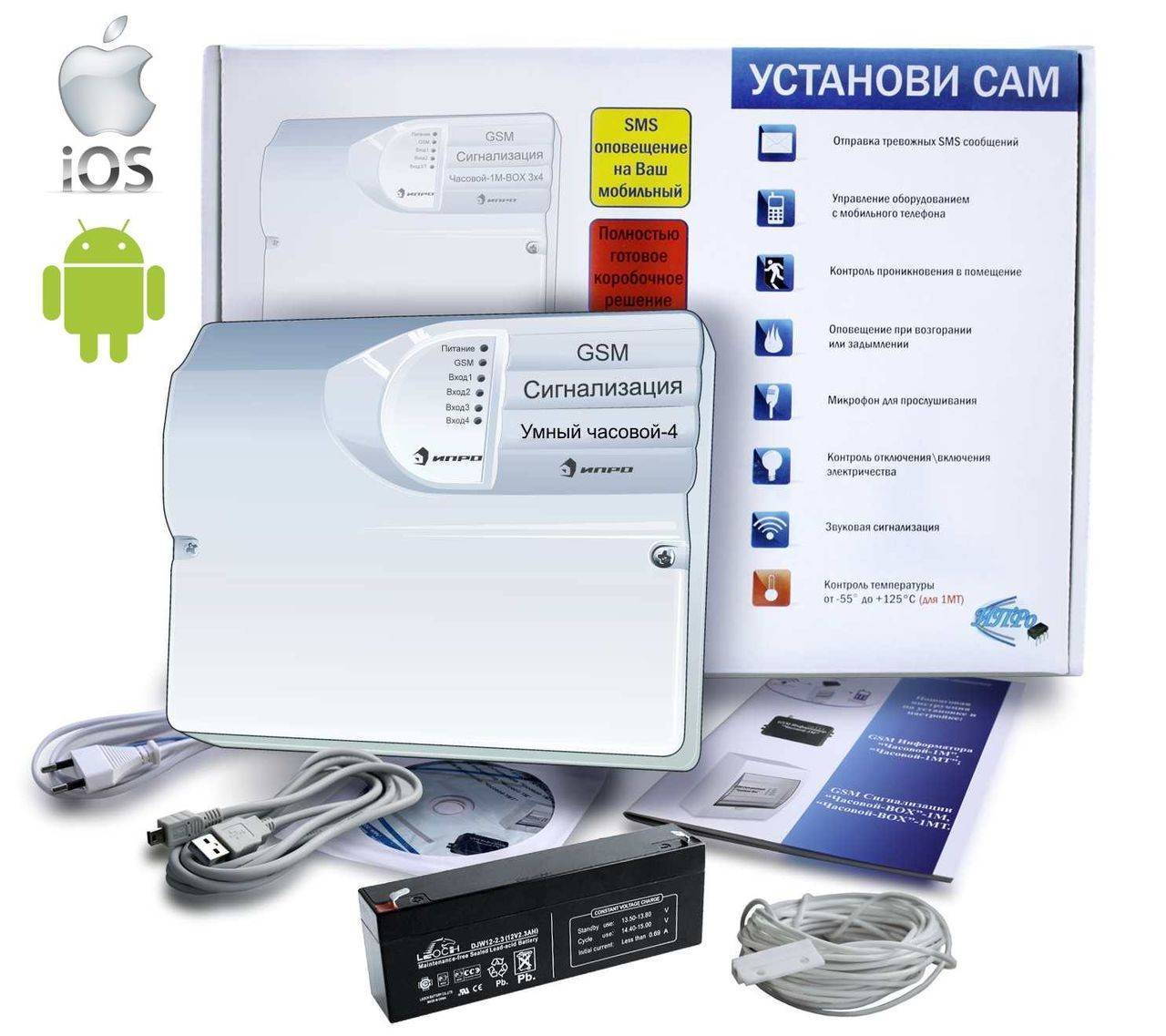 La principale différence est la présence dans le kit de deux capteurs de température déportés avec un fil de 10 m de long, ainsi qu'une antenne filaire déportée et un cordon pour brancher une batterie externe de secours (malheureusement, il n'y en a pas d'intégré). La gestion et le contrôle peuvent être effectués à la fois par SMS et via l'application.