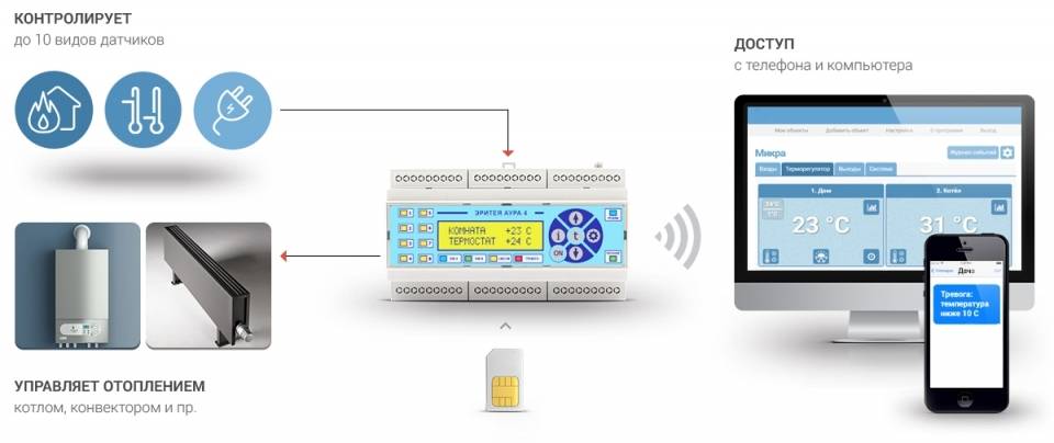 S'il n'y a pas d'Internet dans une maison privée, un module GSM est utilisé, ce qui vous permet de contrôler la situation via un smartphone.