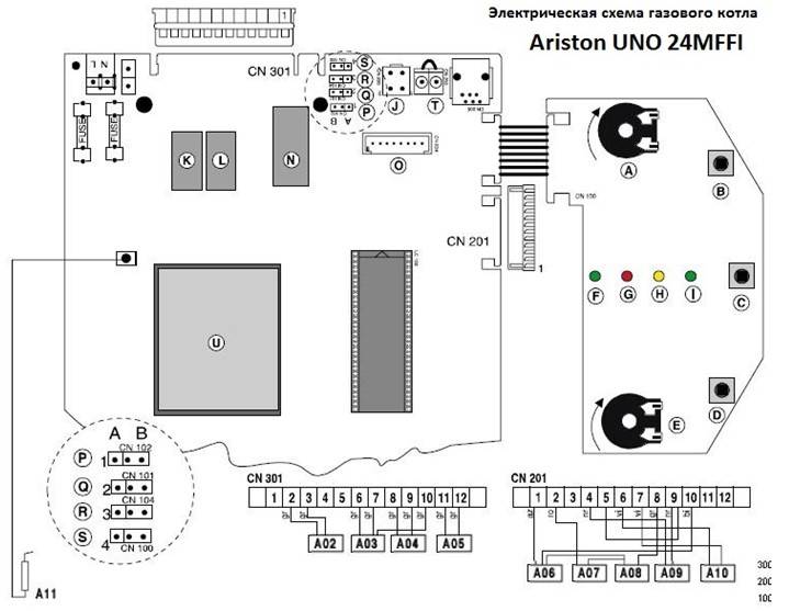 Le circuit électrique de la chaudière à gaz comprend des blocs de cartes électroniques et leurs éléments radio. Vous pouvez considérer un exemple de schéma d'une unité Ariston UNO 24MFFI typique, qui affiche l'emplacement des éléments de la chaudière.