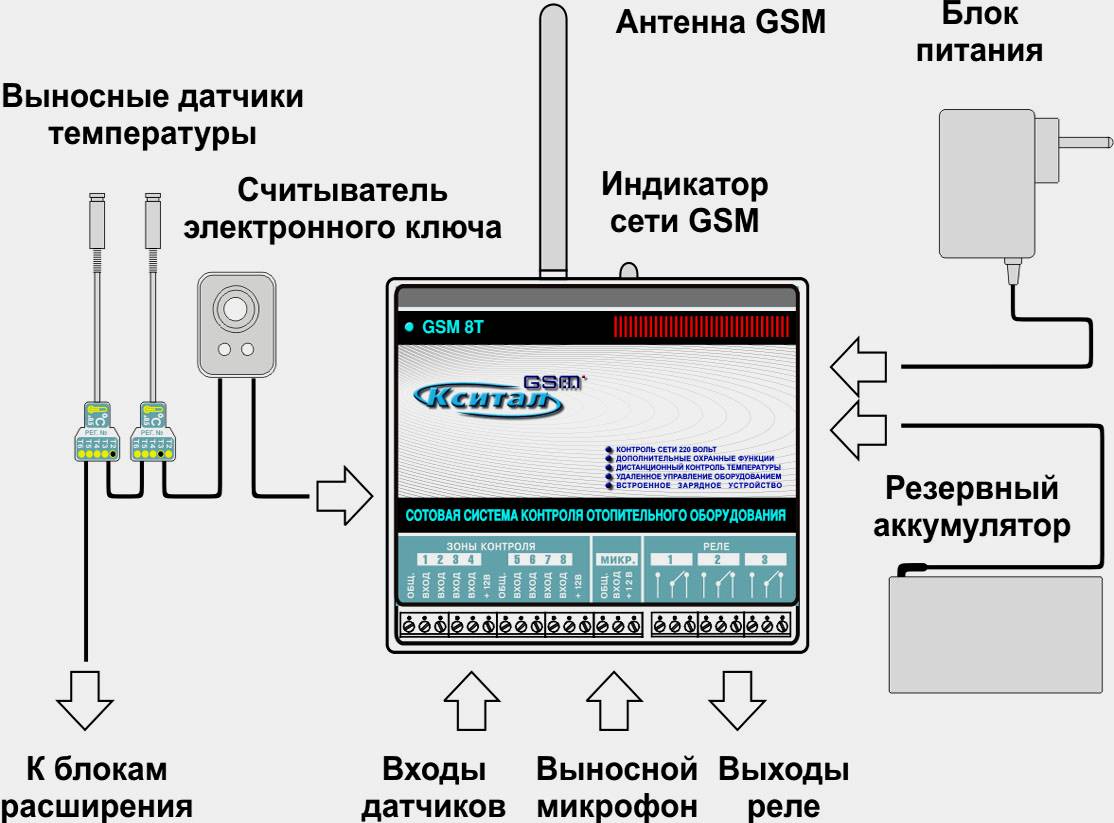 Un autre appareil bien connu, plus professionnel et polyvalent avec un package beaucoup plus riche.La fonctionnalité de contrôle du chauffage est à peu près la même que dans la précédente «chaudière OK» - le minimum requis, cependant, il existe jusqu'à 4 zones pour des appareils supplémentaires (capteur de débit, fumée, mouvement, inondation, ouverture de porte, etc. ). Une clé électronique et un lecteur (semblables à ceux installés dans les interphones) sont également inclus, de sorte que vous ne pouvez influencer les paramètres, si vous le souhaitez, qu'avec une clé électronique.