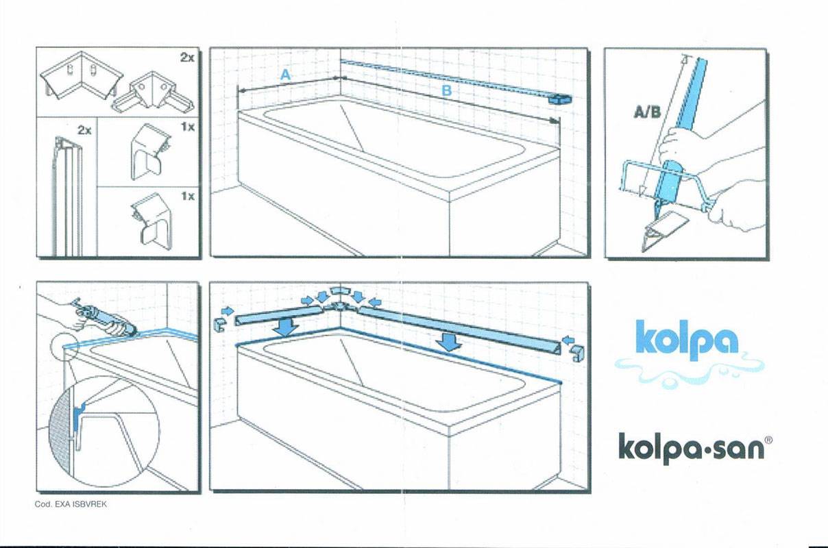 L'installation de la baignoire se fait après la pose de la finition finale sur les murs carrelés. Après avoir installé la baignoire de vos propres mains, le joint entre le mur et le côté est scellé avec du silicone ou un ruban adhésif élastique spécial est collé, ce qui scellera l'écart de l'eau qui coule le long du mur arrière.