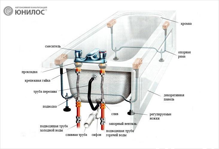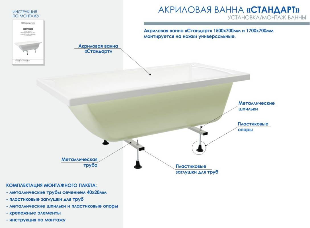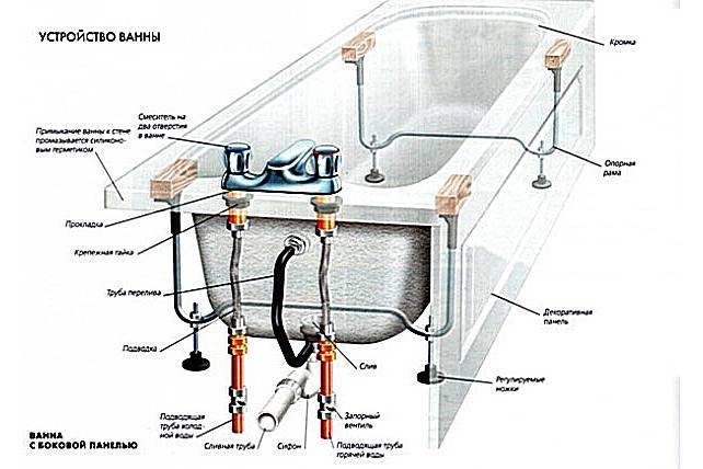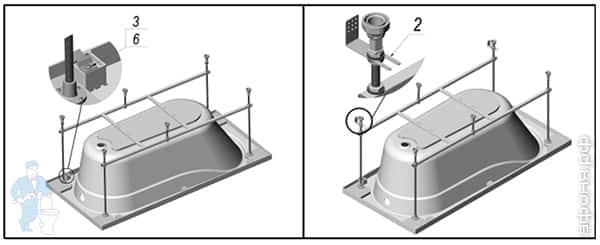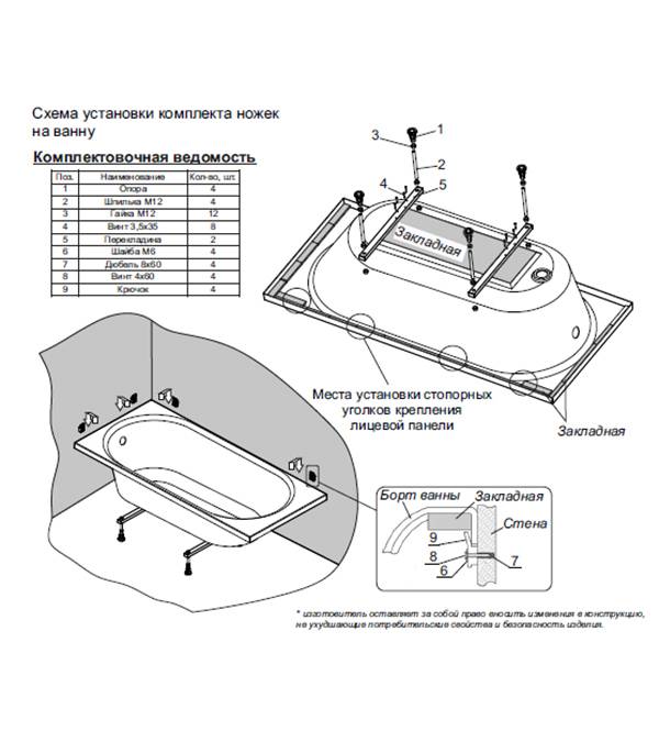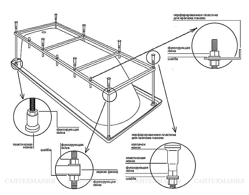 Pour chaque bain, le cadre est développé différemment, donc les nuances d'assemblage sont différentes pour chaque cas. Même pour une entreprise, pour différents modèles de la même forme, les cadres sont différents. Ils tiennent compte de la géométrie du bain, ainsi que de la répartition des charges. Néanmoins, l'ordre des travaux est général, de même que certains points techniques.
