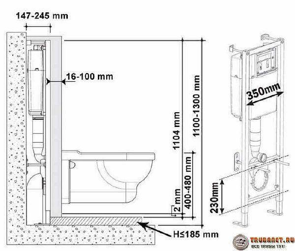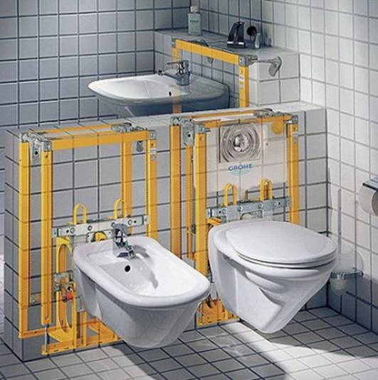 - Installation du système d'installation. Tout d'abord, dans le mur sur lequel le bol sera fixé, vous devez faire une petite empreinte. Ses dimensions doivent être légèrement inférieures aux dimensions du bol.Pour le site d'installation, il est nécessaire de fournir un égout et des conduites d'eau. L'installation est alors construite. Cela doit être fait strictement selon les instructions. Après avoir installé l'installation sur le sol et sur le mur de la salle de bain, il est nécessaire de marquer la future fixation et de percer des trous pour les écrous. Ensuite, nous procédons à la réparation de l'installation. Pour fermer la niche où le système de support métallique est installé, des cloisons sèches, des panneaux décoratifs spéciaux et d'autres matériaux sont utilisés.