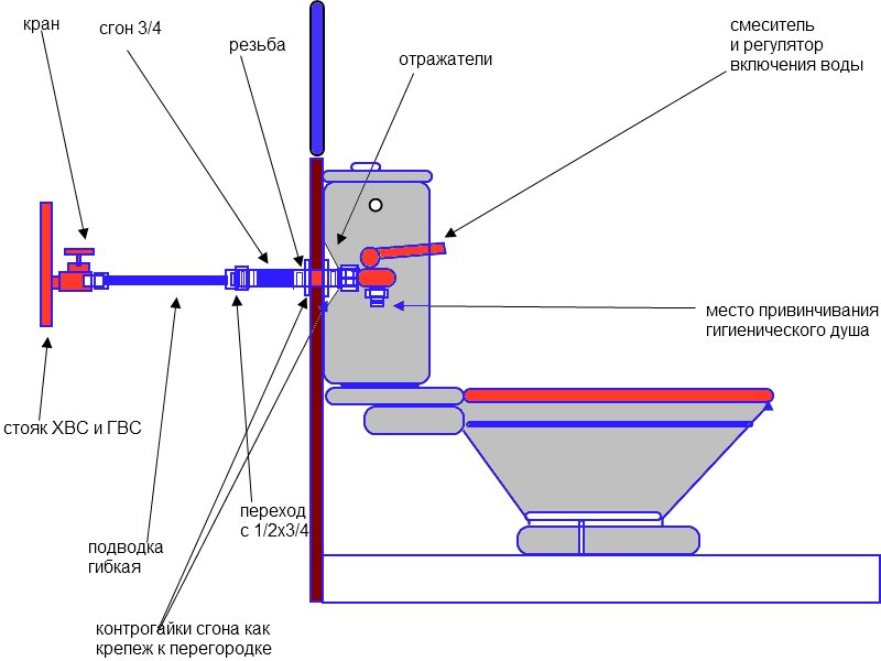 Tout l'eye-liner va dans les murs, il existe des modèles avec un cordon de tirage et il y en a avec un à charnière. Le support peut être fixé près du lavabo ou des toilettes. Parfois, une douche hygiénique est installée dans les toilettes avec un thermostat. Pour une installation cachée de cet appareil, vous aurez besoin d'un schéma de raccordement de douche. Une telle installation est très exigeante et responsable, plus toutes les règles d'installation du produit sont suivies avec précision, plus le modèle servira longtemps à ses propriétaires.Il est impératif d'établir un projet selon lequel le produit sera monté.