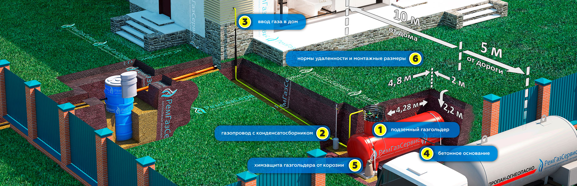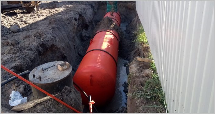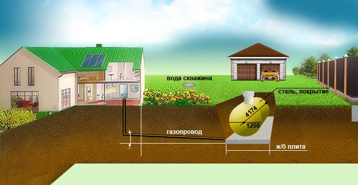 Pour protéger le réservoir du gel et des dommages mécaniques, des réservoirs souterrains sont creusés à un niveau d'au moins 0,6 m.En ce qui concerne le volume des gazomètres, un conteneur d'une capacité de 2 500 à 10 000 litres peut facilement être placé sur une zone périurbaine sans dégrader l'aspect du paysage. Le réservoir est creusé dans le sol de telle sorte que seul le col reste au-dessus de la surface, auquel l'unité est connectée pour effectuer le ravitaillement. Le gaz est fourni à la maison par des tuyaux.