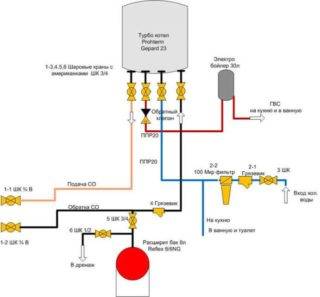 Tout comme une installation de chauffage, les conduites ECS sont séparées de la chaudière par des vannes à boisseau sphérique aux raccordements séparés. Le raccordement de l'alimentation en eau froide et chaude est effectué sans aucune restriction. En tant qu'élément supplémentaire, un filtre spécial est utilisé sur le tuyau d'alimentation en eau froide. Il est recommandé de l'utiliser dans les anciens systèmes avec une alimentation en eau centralisée avec une grande quantité de particules solides insolubles dans le flux. Ils peuvent se déposer sur les parois de l'échangeur de chaleur du circuit secondaire, réduisant l'efficacité du chauffage.