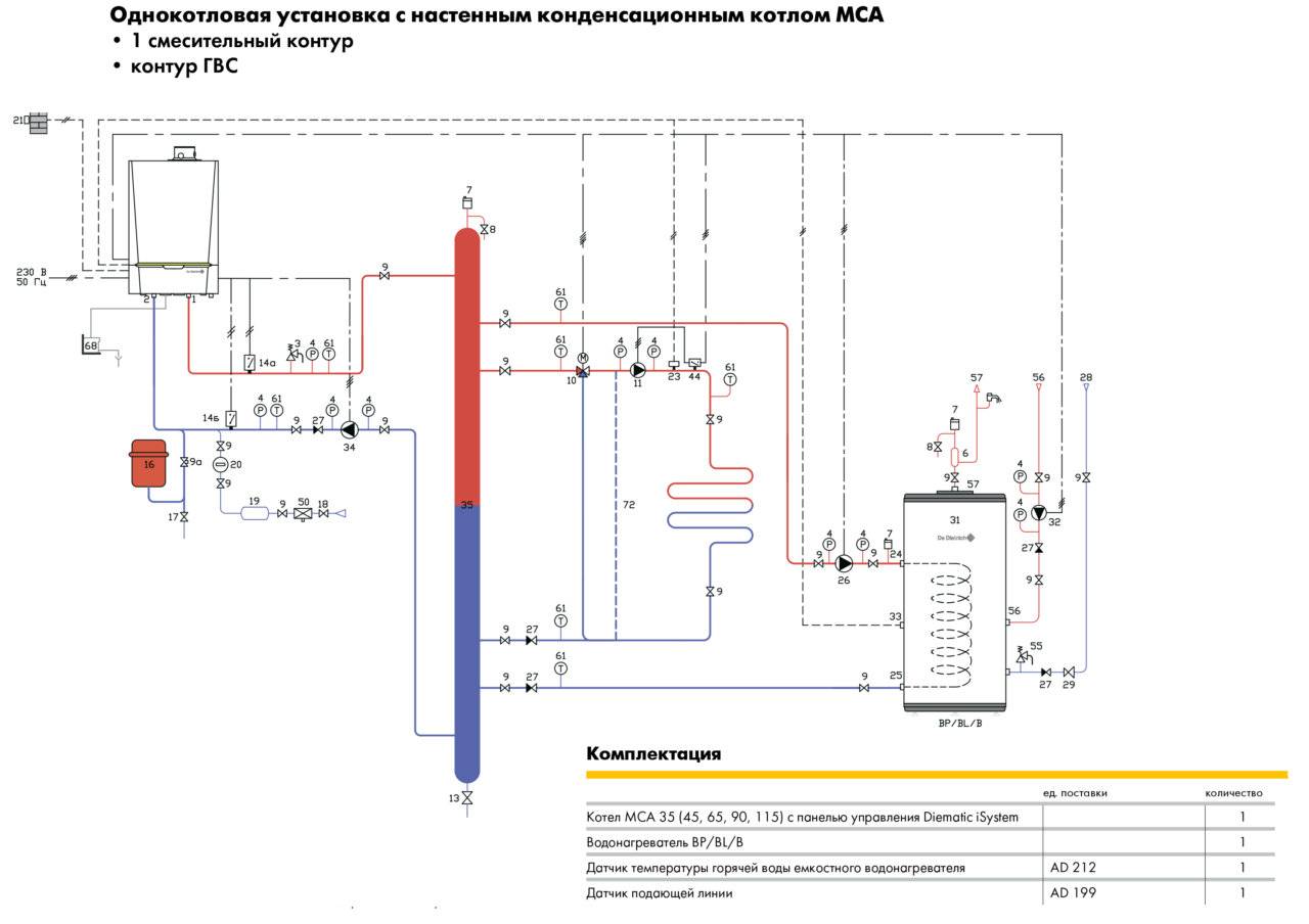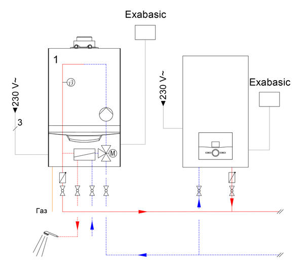 Le schéma de raccordement d'une chaudière à gaz à double circuit au système d'alimentation en chaleur d'une maison privée est réalisé, ainsi qu'une chaudière à circuit unique. La différence réside dans la présence de tuyaux supplémentaires pour le système ECS.Ils sont installés sur les chaudières à gaz comme suit: